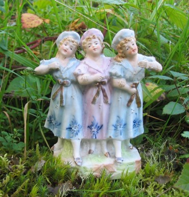 "What are those sweet little Victorian maids doing perched on a mossy rock? I hear you ask. Well...I have a confession. I acquired them from an elderly gentleman when I was 8 years old. In those far off days, Victorian bisque figurines of this type were not greatly valued and so I was allowed to play with them. I immediately set about making the girls a 'romantic leafy bower' in the garden in which too frolic. The trouble was, I was the only person who knew of their frolicking and as a consequence the poor souls were left outside in all weathers for well over a year. Can you believe that? Amazingly, as you can see, they came to no harm. Since then they have travelled through life with me and are now a precious possession. Today, for the first time, I took them back into the garden and I do believe their little faces lit up with joy and excitement as they recalled their past adventures. Rest assured however, their garden visit was short lived and they are now safely back on the sitting room shelf with my other treasures.