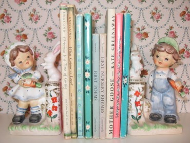 These two little china children date from the early 1960s. They were a birthday gift when I was a child and I have always loved them. They are designed as bookends but are not very stable so I have always used them for just the few small books that you can see here. The little girl's carrot has an end missing and I think her rabbit looks like the greedy culprit wouldn't you say?