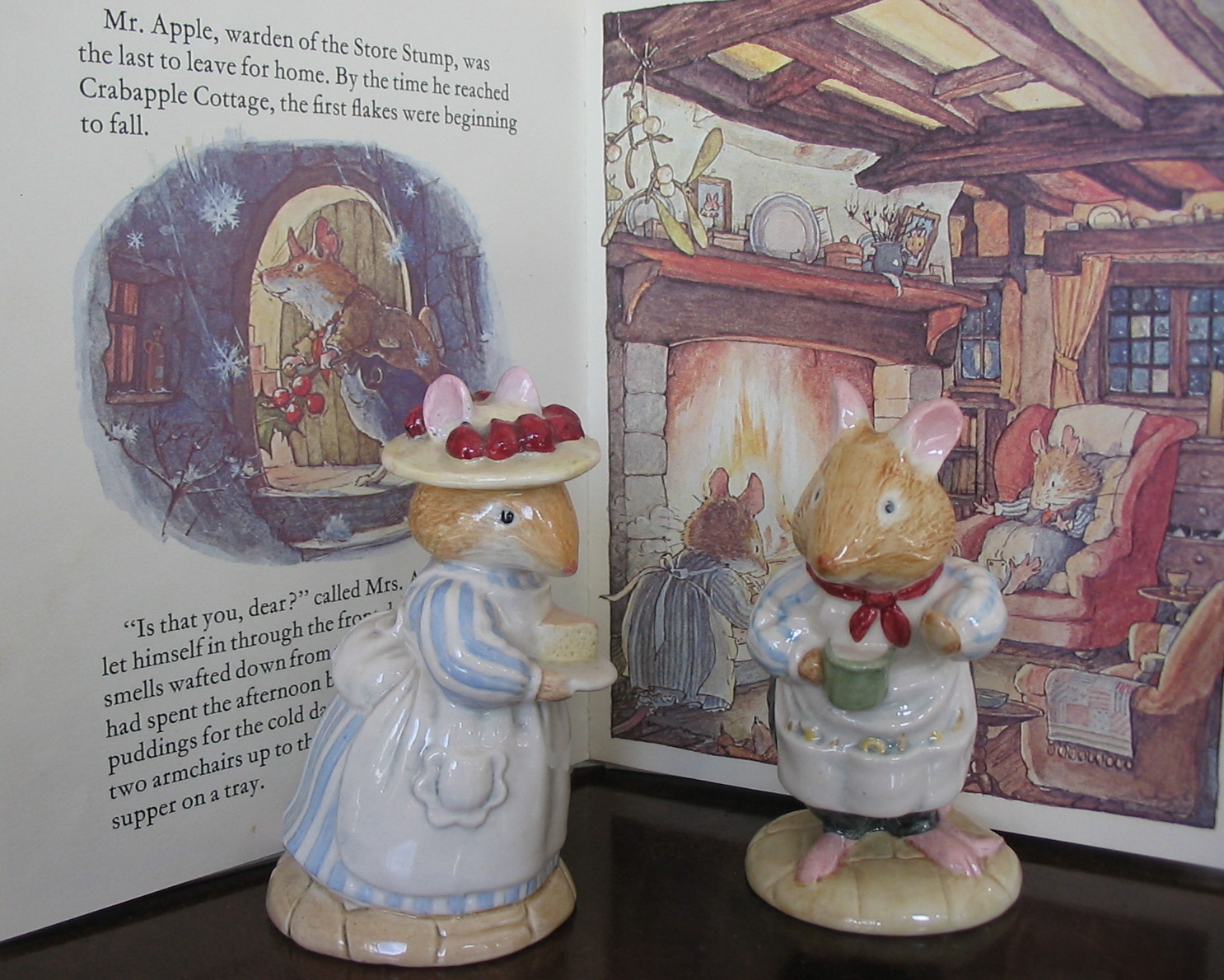 Mr and Mrs Apple, made by Royal Doulton, are characters from Jill Barklem's Brambly Hedge stories and date from the 1980s. I would love to live in the wonderful world of Brambly Hedge. Just look at that lovely little room with beamed ceiling reflecting the glow of a roaring log fire. Snow is falling outside the window and, here I quote from the 'Winter Story'... 'Mrs Apple had spent the afternoon baking pies, cakes and puddings for the cold days to come. She drew two armchairs up to the fire and brought their supper in on a tray'... Doesn't that sound just the cosiest place to live?