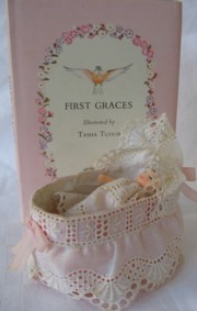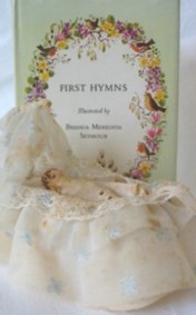 When Christened they both received a little book from Granny and Granddad and I made a tiny baby in a cradle trimmed with blue for my son's Christening cake and a baby in a cradle trimmed with pink for my daughter's. I rooted them out today just to make sure the babies were doing OK. They have been used as dolls house toys over the years so have that 'played with' appearance but now live happily with the cards in a pretty box and seem to be quite content.