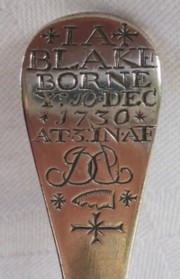 It is engraved with the initials IA and surname BLAKE. Under this is written 'BORNE Ye 10 DEC 1730 at 3 in AF' (3 in the afternoon). Isn't that wonderful? I know that the letter 'J' was often written as an 'I' in those far off days and have many times tried to track down a child with that name who was born on that day. There have been a number of possibilities but no proof. A place of birth might help solve the mystery.