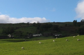 For part of the day the high hills cast dark shadows on this scattering of cottages. The sheep in the foreground are taking advantage of the sunshine. No sign of Bo Peep's woolly companion amongst the flock.