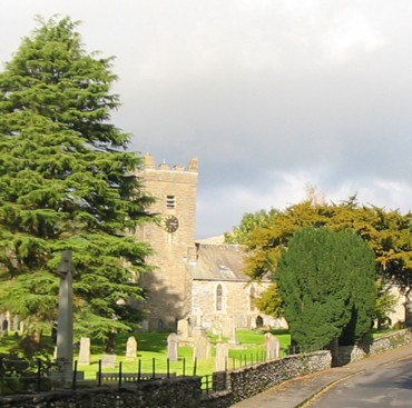Rain clouds part and watery sunlight falls on Troutbeck Church.