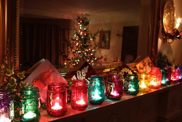 The coloured lights were made for summer evenings in the garden but as the summer forgot to turn up this year they have put in an appearance for Christmas. Made by my daughter and myself several years ago they are simply jars that have been painted with glass paint and then decorated with gold swirls and stars etc. Tea lights sit nicely in the bottom.