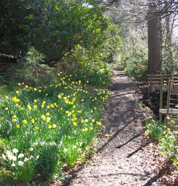 An avenue of daffs guides us down a long path to the far corner of the garden where we have an area for making and storing compost and a place for a (large) bonfire.