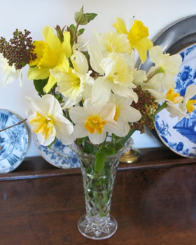 And here is a vase of orphaned daffs, I've placed it on the old dresser in the dining room. I love the combination of yellow blooms and blue and white china.