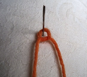 Use bright orange yarn and cut off a 6in (15cm) length. Secure a tapestry needle into the arm of your sofa, a cushion (or similar) and wrapping the yarn around the needle, tie a knot in the centre (see picture below).
